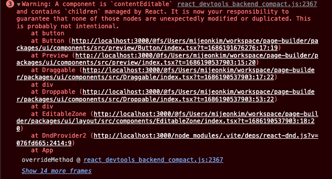 하지만 실제로 요소에 contentEditable를 추가한 후 화면에서 텍스트를 수정해 보면 다음과 같은 warning이 발생한다.