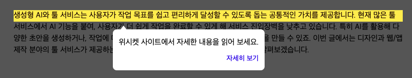 생성형 AI와 툴 서비스는 사용자가 작업 목표를 쉽고 편리하게 달성할 수 있도록 돕는 공통적인 가치를 제공합니다. 현재 많은 툴 서비스에서 AI 기능을 붙여, 사용자가 더 쉽게 작업을 완료할 수 있게 해 서비스 진입장벽을 낮추고 있습니다. 특히 AI를 활용해 다양한 초안을 생성하거나, 작업에 대한 피드백을 제공함으로써 더욱 고도화된 결과물을 만들 수 있죠. 이번 글에서는 디자인과 웹/앱 제작 분야의 툴 서비스가 제공하는 무료 AI 기능이 어떤 사용자 경험을 제공하는지 살펴보겠습니다.